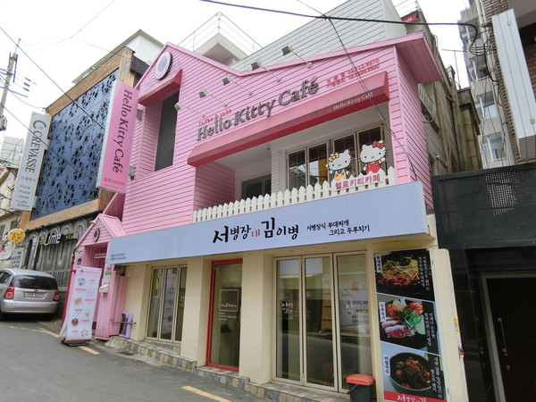 女子梨花大学周围都是些可爱的小店,不少饰品,头饰和衣服。随便逛逛就消磨不少时光,收获颇丰。累了找到Hello Kitty Cafe. 粉粉可爱的Hello Kitty一直在每个女生的心里。其实Hello Kitty是1974年生人,严格来说是日本大妈了。用美颜相机拍了张卖萌照片。