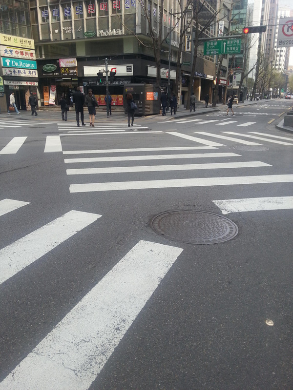 首尔第三天。发现一个有趣的现象,首尔街道是可以斜着过马路的。去斜对面就不用先横后直了。