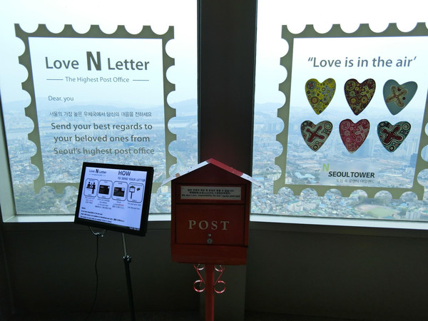 观景平台也和其他高塔的观景层一样,在各个方位标出城市和距离。唯一不同的是,可以在这里寄明信片给朋友,取意 Love is in the air. 果然很有韩剧的浪漫。还有就是从窗口望下去,樱花成径。