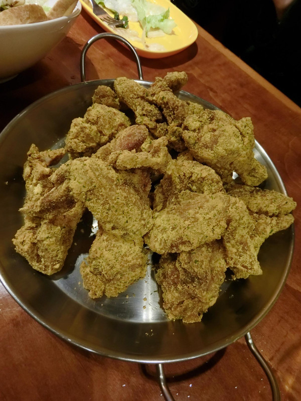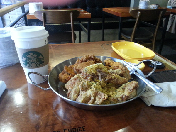 接下去第二场,啤酒炸鸡。第一天到首尔其实是想找Twotwo炸鸡,是大众点评网的人气炸鸡,无意间误打误撞进到这家不知名的小店,炸鸡的味道却惊艳了味蕾,让我念念不忘。今天再来一次。这家店的炸鸡真是比Twotwo好吃太多,但是在国内的各类旅行网站上几乎没被提到过。可能是因为它的名字太不像一个店名,叫Better Happier Choice (BHC) 。后来查了一下韩国留学生网站才发现,原来BHC是韩国排名第6位的有名炸鸡,代言人是全智贤。原来人家店里全智贤的海报不是随便贴贴,人家是正派代言人。难怪我起初问店员twotwo在哪里,人家鄙夷的说,我们做的炸鸡更好吃。
