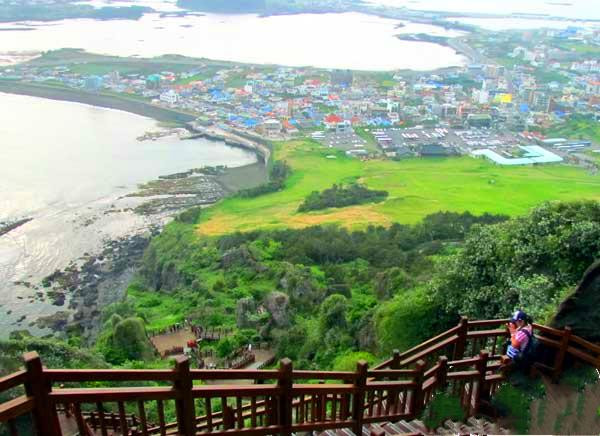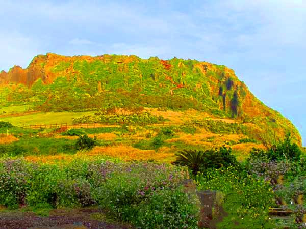 离开涉地岬驱车不远就是城山日出峰。同样也位于济州岛东端的城山日出峰海拔182米,系10万年前海底火山爆发而形成,为汉拿山360个子火山之一,也是世界上最大的突出于海岸的火山口。火山口直径600米,深90米,面积达8万多平。99块尖石也称为九九谷,围绕在火山口周围,使得城山日出峰看起来好像一顶巨大的王冠。