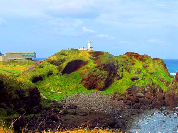 涉地岬以春天的油菜花和以城山日出峰为背景的美丽海岸风景而享有盛名,这里有悠闲吃草的短腿马,还有岩石包围着的海岸绝壁和顶天屹立的立岩。与济州别的海岸不同,涉地岬的岩石由红色的火山灰构成。2003年因拍摄电视剧《All In》而出名,有教堂、灯塔等绝美的海景风光。
