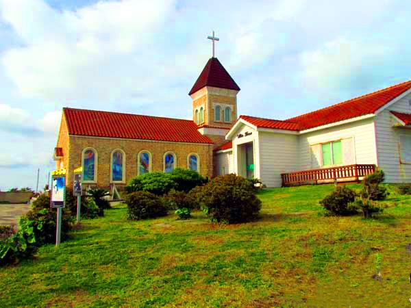 终于来到灯塔脚下,顺着铁台阶轻松地登上灯塔,这里也是涉地岬的制高点。凭栏环顾四周远眺,涉地岬海岸的风景尽收眼底。辽阔平缓的考地山坡上有高约4公尺,呈边长9公尺的正方形石结构的烽燧台,至今保留着原貌。下山时路过欧式教堂前观赏,只见红色屋顶与浅黄色墙壁交相辉映,屋顶上的十字架注解了这座建筑物的用途,这里也是当年拍摄电视剧《All In》的主要外景地之一。