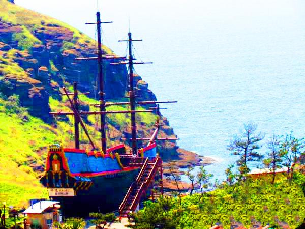 由于山房山脉向海岸延伸时受到侵蚀作用,形似龙头探入海中,故称龙头海岸。这里有几千万年堆积而成的砂岩层。深深凹陷的山洞以及宽阔的岩壁侵蚀地层,形似房间,以美丽的曲线层层堆积,景色十分壮观。通向海岸的路上有“Hamel漂流纪念碑”,这是为纪念1653年漂流到此并在此居住的Hamel而建。海岸的右侧有柔软的黑沙滩。此外在这里还可看到海女们在卖刚刚抓获的海参,紧靠着海边有一条路,可在此休闲散步。由于这里曾经发生过一个神奇的传说,所以这里的风景也充满了神秘的色彩。