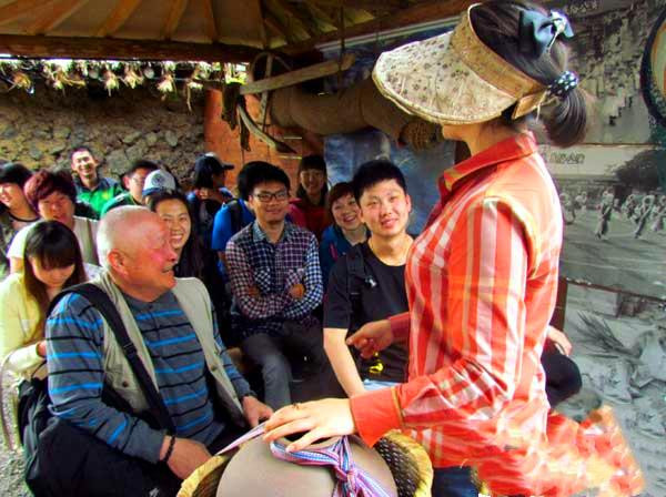 球迷们最后在济州岛上的行程是参观位于济州西归浦的城邑里民俗村,这里是一处保留了韩国传统民俗的村落,住着济州岛上的原住民。村里有400多栋屋子,原汁原味地保留了古代村庄房屋的原貌,屋顶以茅草覆盖,院墙用石头垒砌,民宅的大门用横木取代,显得十分质朴可爱。还能见到一些济州岛特有黑毛土种猪和“通西”(猪圈兼厕所)等,村中那古老的榉树、朴树,则见证了此处作为古代旌义县城500年的悠久历史。