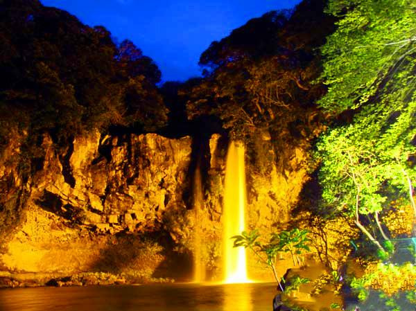 当晚,观赏天地渊瀑布是球迷们济州岛当日的最后一项行程。吴石峰说:天地渊瀑布风景区是济州市民经常光顾的休闲的地方。这里的瀑布称谓恰如其名,奇岩绝壁高耸入云,瀑布从黑色熔岩的悬崖峭壁上发出雷鸣般的声音倾泻而下,宛如自九天落下的银河。白天来是一种十分壮观的景致,而观瀑布夜景更是别有一番风味。每当夜幕降临,华灯初上,在灯光的映衬下瀑布从天而降,水珠飞溅,流光溢彩。果然,当球迷们夜观天地渊瀑布后纷纷对瀑布夜景赞赏有加。