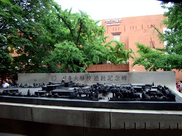进公园不远是首尔大学遗址纪念碑。环顾四周,绿树丛盈,正面和左面是几座绛红色的剧场建筑群,园内还有一座新闻工作者的纪念碑和一座孤山尹善道五友歌碑,靠近剧场的方向是一个篮球场,几位大学生正在此激战正酣。