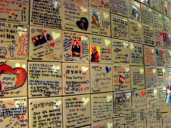 围绕着首尔塔大厅外有一组长长的情侣锁悬挂的区域,数不胜数的各种五花八门的锁头上都带有一个小小的心形卡片,上面是情侣们海誓山盟的留言。