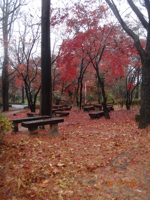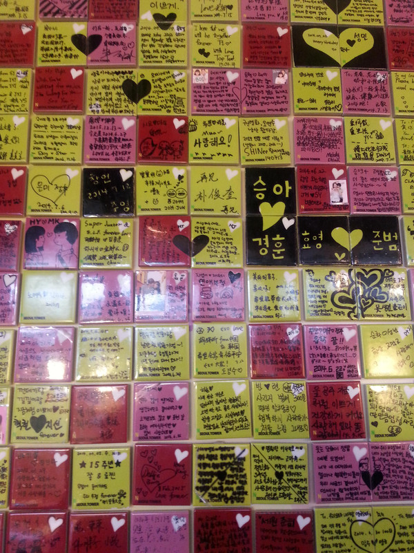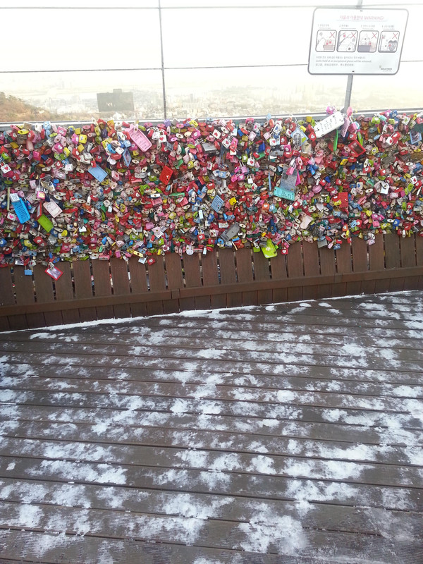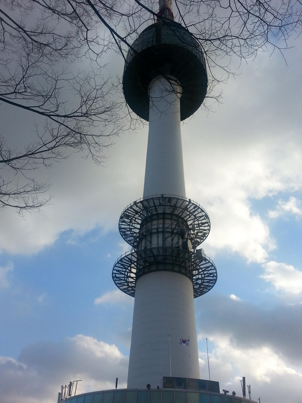 没办法,继续上山,折腾了半天,找到了公交车,但是方向不对的,后来看到韩国oba在等车,搭讪问了路,知道这个车其实是单行道的车,只有一个方向来回开。跟着oba上车了,到首尔塔的公交站下来,是底站也不用担心。盘旋了很长的一段路,才达到底站。下来爬了1个很陡很长的坡才上到了上面。