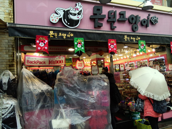 明洞很大,遇到韩国的初雪,很冷,就没在上面怎么逛。在地下逛了当地的地下商场,实在有点远,随便逛了几家。后来去了yong 什么的商场,都是卖年轻人衣服的商场。衣服挺漂亮的,质量也好,不贵,羽绒服1000人民币左右,大衣比较少,有漂亮的卫衣(350-150不等)。