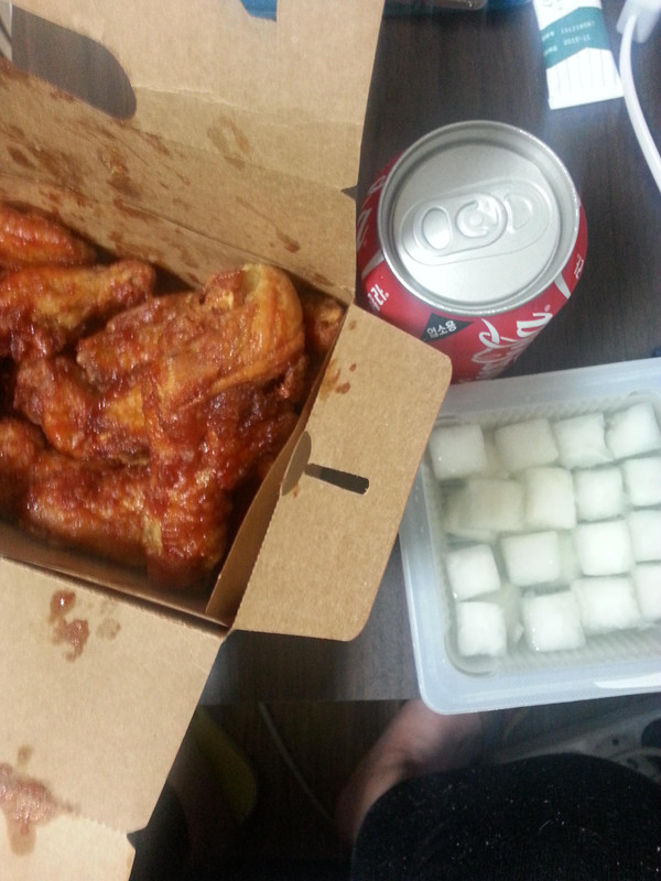 晚上在酒店点的炸鸡,1人份 18000韩元,分量很足,非常非常好吃,有点辣哦~