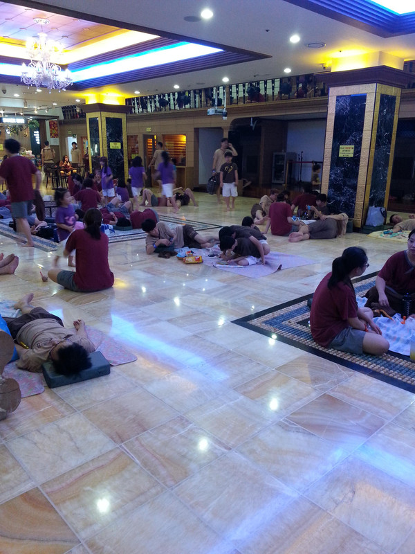 步骤:前台拿好洗浴中心的衣服,取带钥匙的号码牌——脱鞋进入有鞋柜的区域放鞋子——进入女士衣物间换给的衣服,钥匙跟鞋柜的共用1把——吃饭——继续回女士衣物间脱衣服——进入浴室冲澡(必须冲完澡以后才能泡汗蒸)——各种池子(咖啡池、浴盐池等)——穿好衣服进入男女共用地,有各种汗蒸的小房子(艾草、石头等)——回女士衣物间换衣服,衣服直接放在衣服堆即可——到前台结账