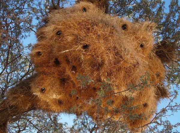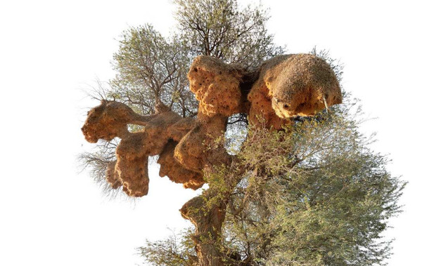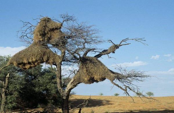 如果有幸去南非旅游的话,在荒漠中的树干上你就会看到这样的超大型的鸟巢,一般在乡下的街道也会有,总之是比较常见的,如果别人不说的话,你很难想象这是鸟为自己做的房子,并且里面的空间非常大和复杂。一般这些巨型的鸟巢分布在纳米比亚、博茨瓦纳等南非的国家。