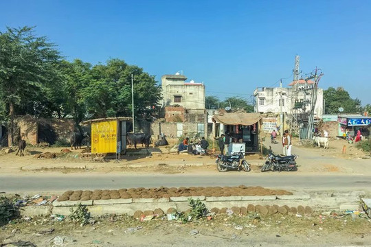 堆在隔离带上晾晒的牛粪饼。每个牛粪饼约重200克,用牛粪混合茅草制成,印度人将牛视为神圣,牛的粪便也一样受欢迎。 “屠妖节”期间,牛粪饼属于祭祀用品,还常常供不应求呢。