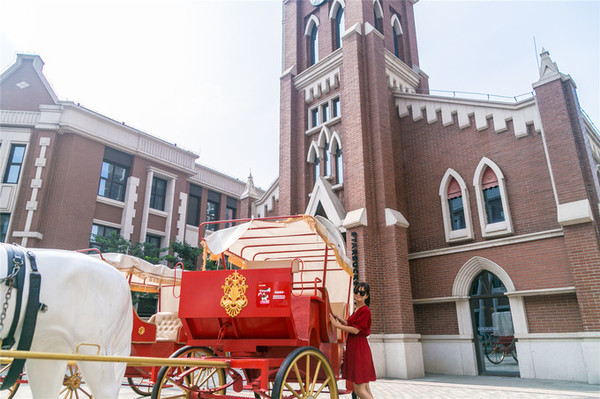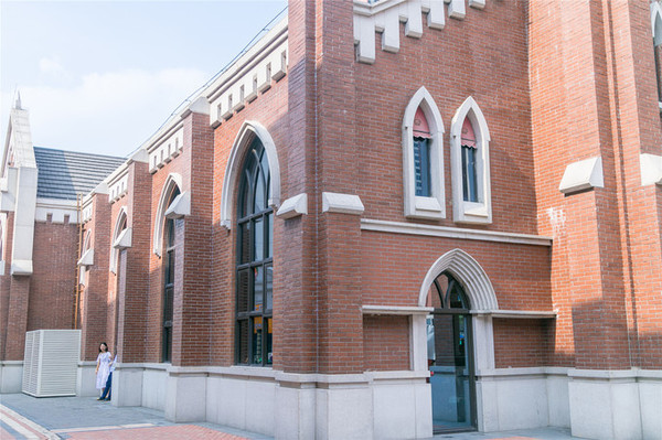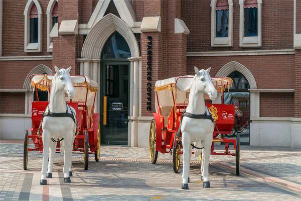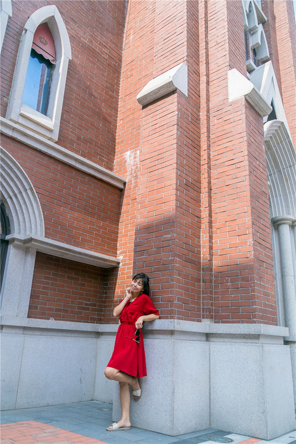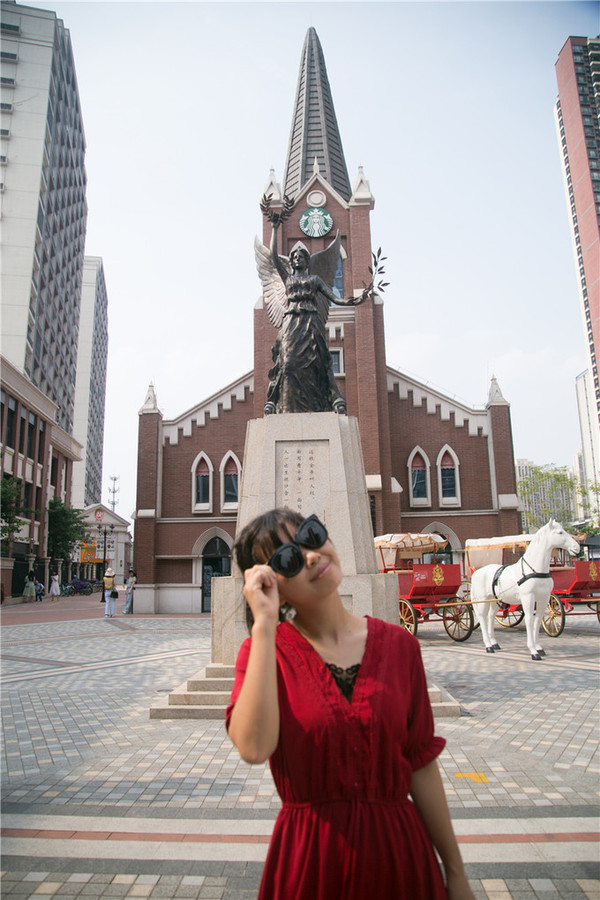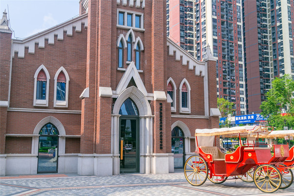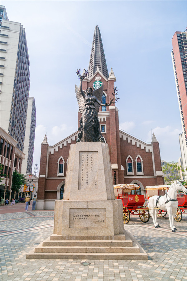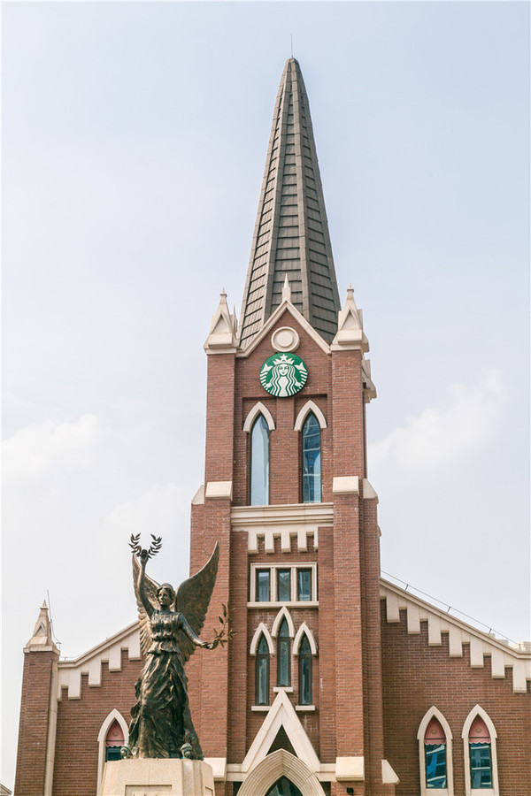 教堂是哥特式建筑风格,外墙呈现复古砖红色,教堂外面还有天使雕塑像、红色马车、喷泉以及许愿池广场,仿佛一秒穿越到 欧洲 。