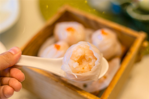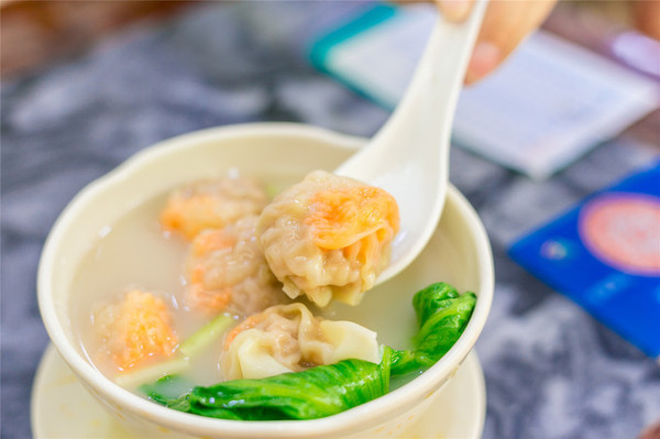 一个个硕大的云吞隐隐约约就看到大虾和小鲜肉与你招手,咬下一口,汤汁立刻从馅里流出来,虾仁、猪肉馅、蟹籽清晰可见,吃上三四粒顿感幸福和满足!
