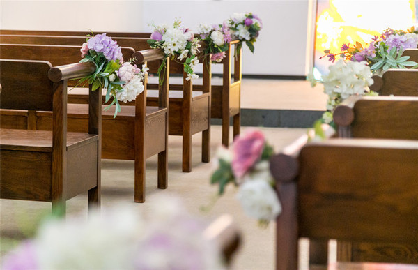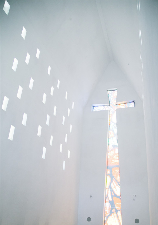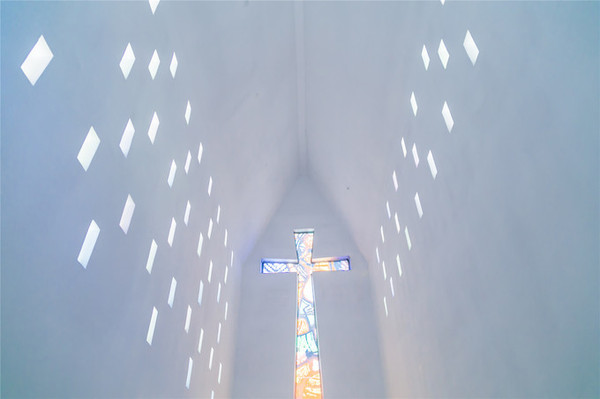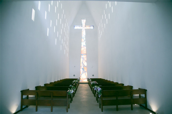 穿过 石门 走进教堂,教堂的礼堂里面整整齐齐地摆放着木长椅,教堂顶部白墙上的七彩十字架神圣庄严,几个透着光的方形孔折射出唯美的光斑,如果在这里举行一场婚礼,肯定很浪漫吧!(很难想象一个三十多岁的二孩中年妇女,经常将浪漫放嘴边)