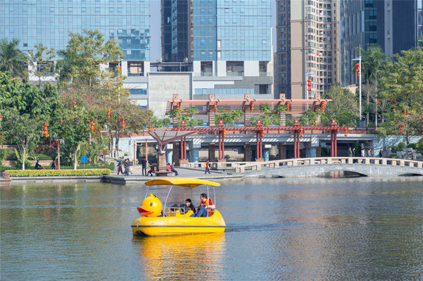 带着小朋友泛舟在湖上,一边吹风一边看 佛山 的高楼林立。