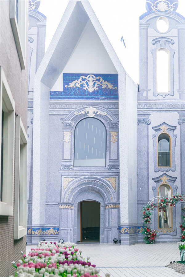 沿着莫兰迪色系的楼梯蜿蜒而上,教堂就会跃在眼前。