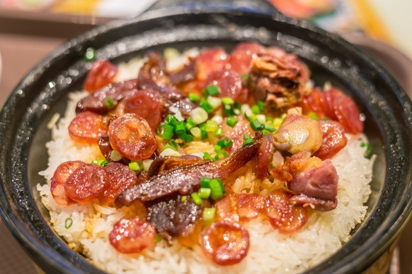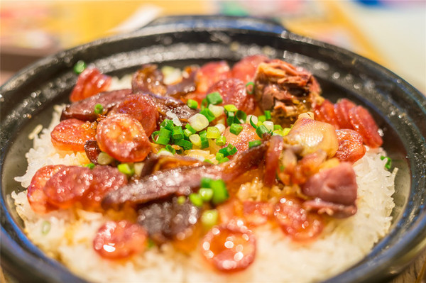 腊肉的香、腊肠的甜、腊鸭的咸,三种腊味的味道汇聚在一起,随着在煲仔内升温,精华都完完全全渗透到晶莹饱满的米饭当中。