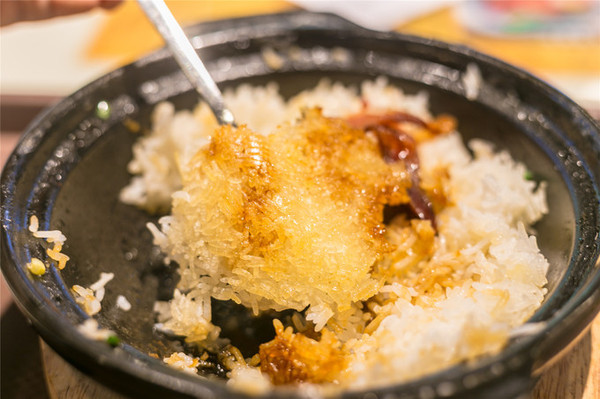 当然,煲仔饭的重点是煲底的一层锅巴,金黄的锅巴脆得嘎嘣响,带着阵阵焦香,比薯片还要好吃啊!