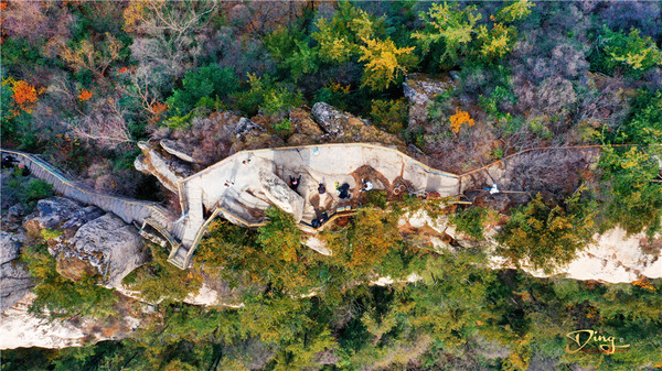 玻璃栈道建在风景秀美的白云山悬崖绝壁之上,山体落差数百米,其侧如刀削斧劈,那栈道就那样高高地紧贴石壁悬浮于空中。