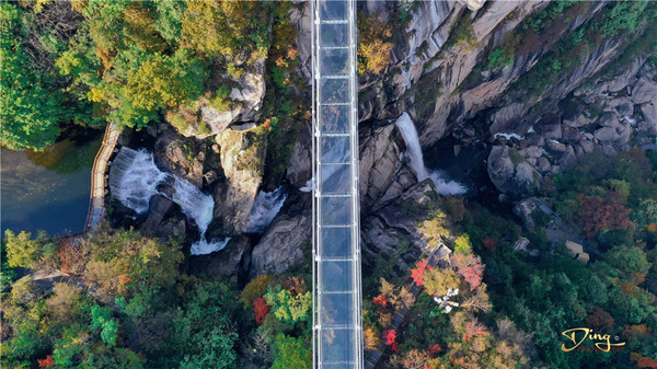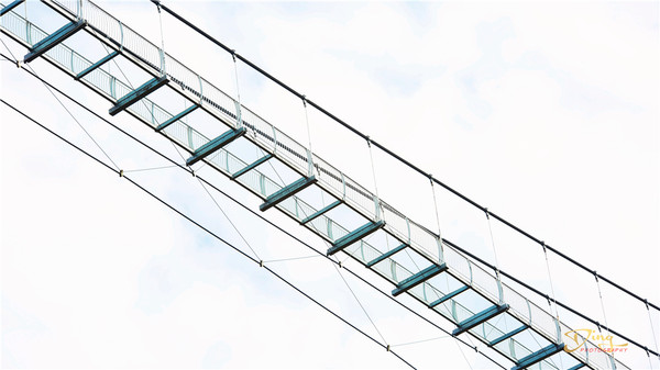 桥面采用横梁作为传力体系,上铺钢化玻璃桥面。玻璃桥面净长190米,走在玻璃天桥上脚下就是万丈峡谷。
