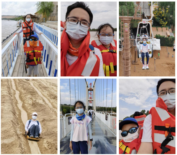 不到5分钟,老马就把我们送到了景区大门。进门后左手边就是坐快艇的地方(羊皮筏子+快艇是一张票,坐快艇到黄河上游,再坐筏子漂下来)。我们家小崽再次享受到了身高“优势”,全程免票。快艇是真快,不一会就把我们送到了上游。这里正好是“爸爸去哪儿”栏目介绍过的滑沙道景点,也是两个崽崽心驰神往的地方。毫不犹豫的买好票,坐缆车到达坡顶,然后排好队体验一下在名头这么响的沙道上滑下去是什么感觉。到达坡底以后,我问她俩好不好玩,两个崽崽平静的说了声“好玩”,似乎还没大漠里的“滑沙自由”的吸引力大。滑完沙以后,沿着黄河两岸的景观步行道继续往前走,来到黄河3D玻璃桥。从玻璃桥往回溜达,沿路绿树成荫,没多久就来到了坐羊皮筏子的地方。介绍羊皮筏子的时候我没仔细听,倒是快靠岸时艄公唱的《宁夏》和《宁夏恋》两首西北民歌惊艳到我了,那音质和情绪比参加选秀的歌手更纯正和真实。上岸的时候,艄公还不忘请我们帮忙到岸边服务点填个表,给个好评。我一边填着表,一边感叹:这都“卷”成啥样了,没点才艺都不好意思当艄公了!
