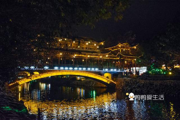从观景台下来,沿着河边走走逛逛,其实近处看的夜景会比从高处俯瞰的更漂亮,风雨桥亮起了灯,仿佛是染上了一层黄金,金灿灿的特别美。