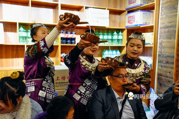 最有特色的就是“高山流水”的敬酒了,苗族小姐姐边唱歌边向你倒酒,当客人在喝碗中酒的时候,多名苗家姑娘将酒罐呈阶梯状往客人酒碗里加酒,这样就像高山上流下泉水一样,就会有源源不断喝不完甘甜的米酒流进客人的口里。