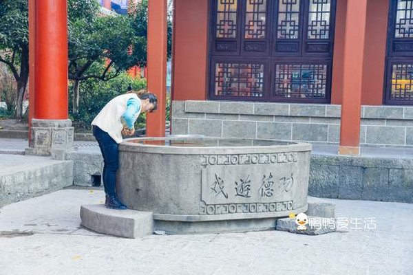 在大雄宝殿前面还有一个游戏功德的大石台,石台里面装的是清水,跟我们常见的投硬币做功德一样,池子里有三个净瓶,考验看你能在水中准确的将硬币投入进去。