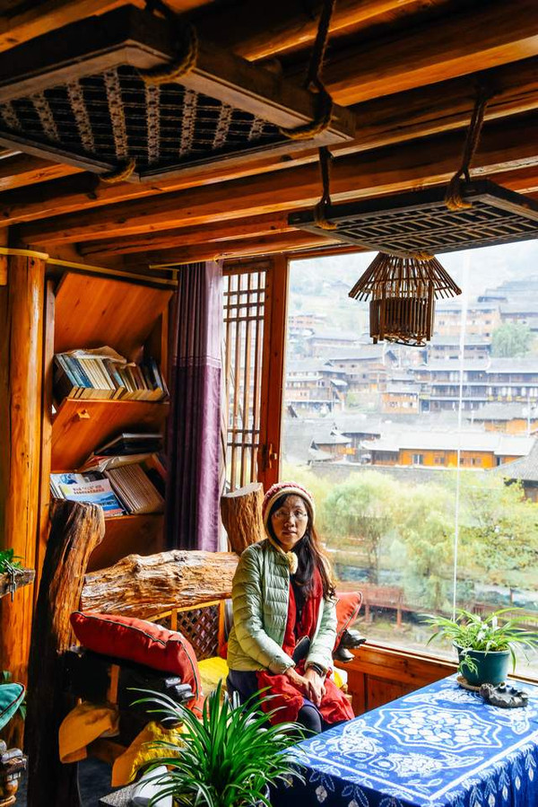 民宿老板多会来到指定风雨桥接客人,这家是位于5号风雨桥附近,房东会帮忙拿行李上去,大概要爬4层楼,楼梯还是比较好走的。从民宿也可以一路步行往上前往观景台。一楼前台的休息区就很有少数民族风情,落地窗正对着就是对面的苗寨,观景拍照极好。