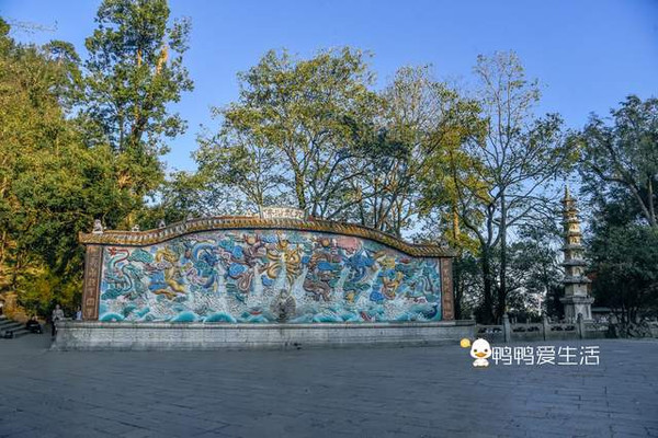 正对大门是九龙浴佛石壁,经传释迦牟尼佛诞生时,九龙吐水为之沐浴。