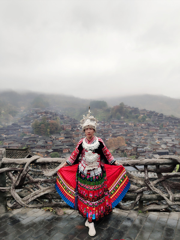 在苗寨,有很多出租苗族衣服的店铺,都是明码标价,租赁一套衣服半小时10-50元,既然来都来了,当然得体验一把了!我身上穿的这套是30元的,包括头饰配饰衣服全套,还是有点重量的哦。