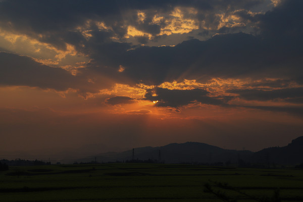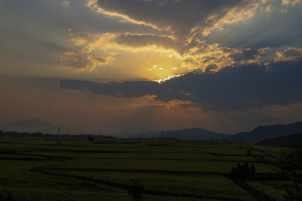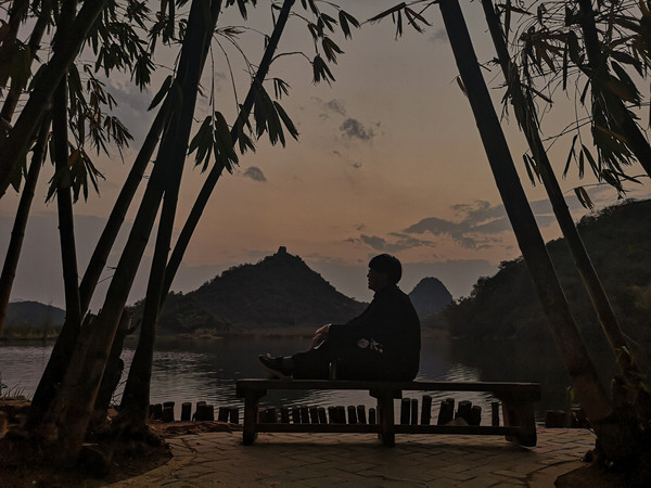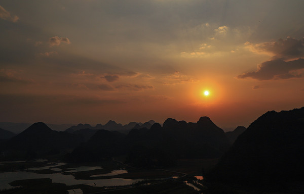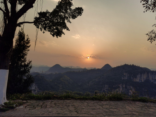 出来不到七百米,就到了青龙山。感觉有些累不想爬山了,到山脚下看看不是太高,就爬吧,还想拍落日呢。终于爬到山顶,找好拍照的位置,时间还早,下午三点半左右,想先找个地方坐下,没想到意外发生,可能有点累了,一个踉跄人就扑倒在地,相机也摔了。疼得站都站不起来了,周围的游客帮忙把我扶起来,让出地方给我坐下。摔的有点狠,左肩疼的不敢动,右手擦伤严重,疼得我直掉泪。一个多小时后才缓和了些,老头想扶我下山,跟头都摔了,我怎么也得把落日拍了啦。明天早上肯定没法再爬上来拍日出了。坚持等到七点多,拍完落日下山,实在是走不动了,坐当地村民的三轮车,一人十元回到停车场。晚饭也没做,去村里喝的米线。