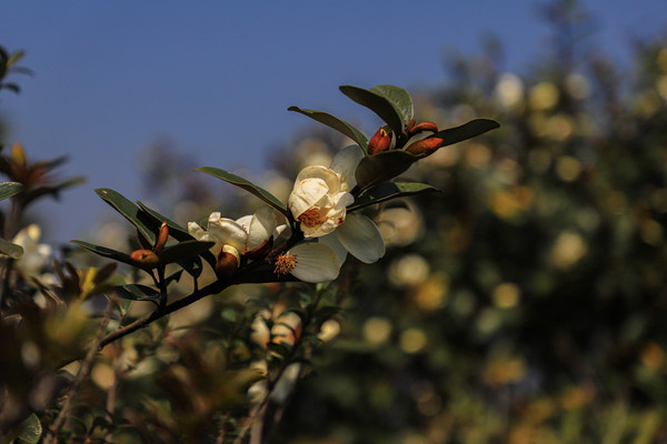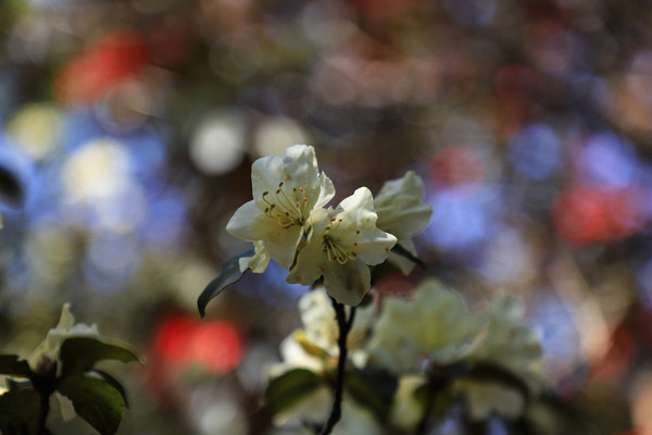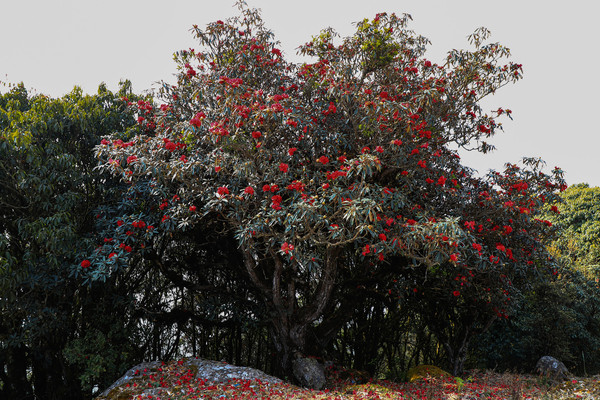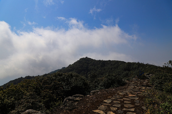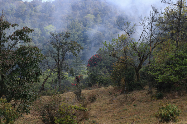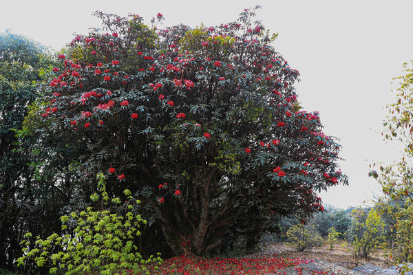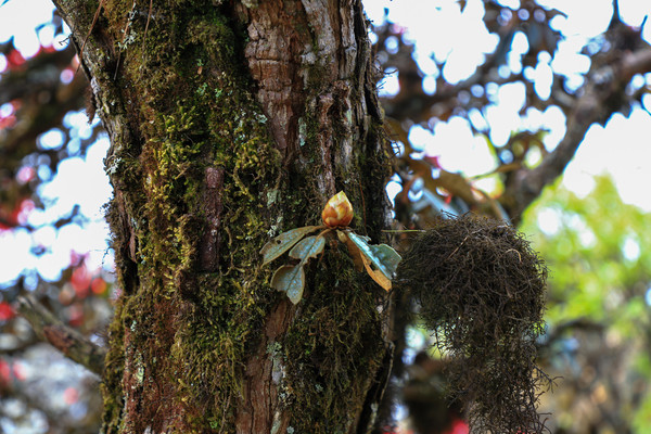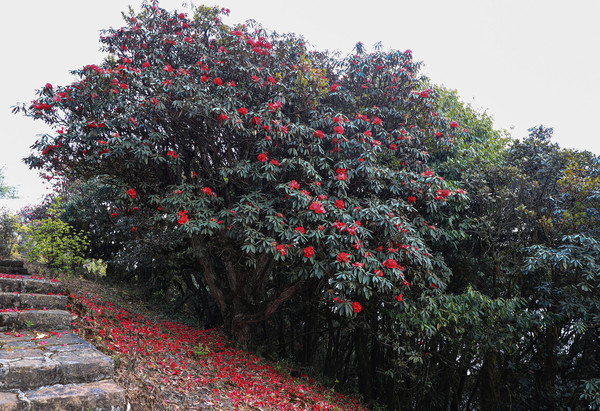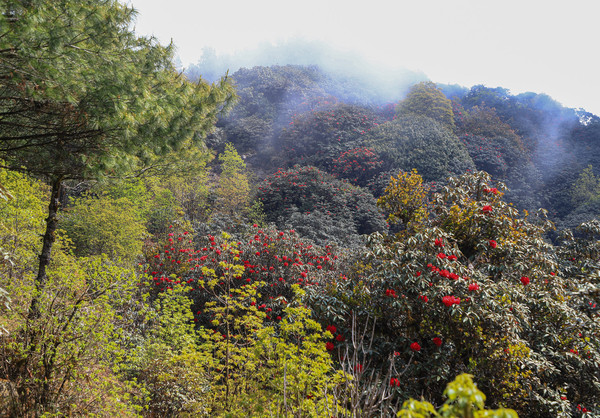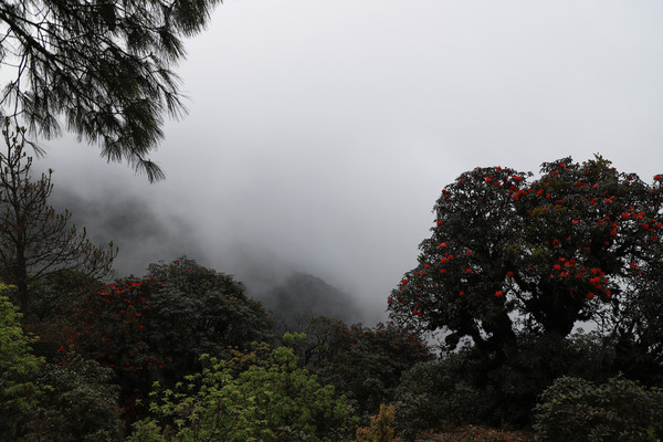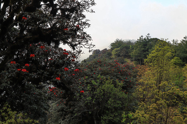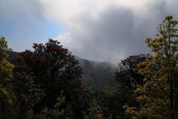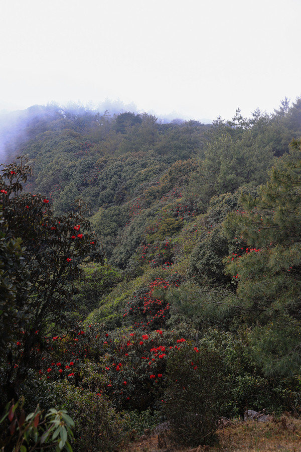 第二十七天3月24日 磨盘山国家森林公园,门票四十元,女同志因三八妇女节月底之前免票,园内观光车分段收费,到圣火台四十每人,到敌军山七十每人含圣火台。我们要去敌军山看百亩杜鹃。司机师父姓柏很热情,游客也不多当时车上也就我俩,送到敌军山下大概用了四十分钟左右。告诉我们沿山脊走环线2.6公里大概两个多小时,问体力能不能行,得到肯定回答,就留下电话号码等下山打电话再来接我们。敌军山是风景区里最远的地方,一进山林就被盛开的杜鹃花给镇住了,千年野生杜鹃,树干粗大,枝头开满杜鹃花,枝干长满青苔,色彩斑斓。这个时间点来磨盘山多少有点尴尬,马缨花刚刚落败,地面上还能看到落花一片片,杜鹃花还没到盛花期,看不到漫山遍野的映山红。但我们已经很满足了,千年野生杜鹃可能只有在这里才能看的到吧。顺着山脊绕到山背面时,还看到一大片山茶花,和映山红混在一起,红的白的煞是好看。刚上山时还有浓雾,一时清楚一时朦胧,等到了十一点多云开雾散,今天算是我们到云南以来第一次真正意义上的蓝天白云了。