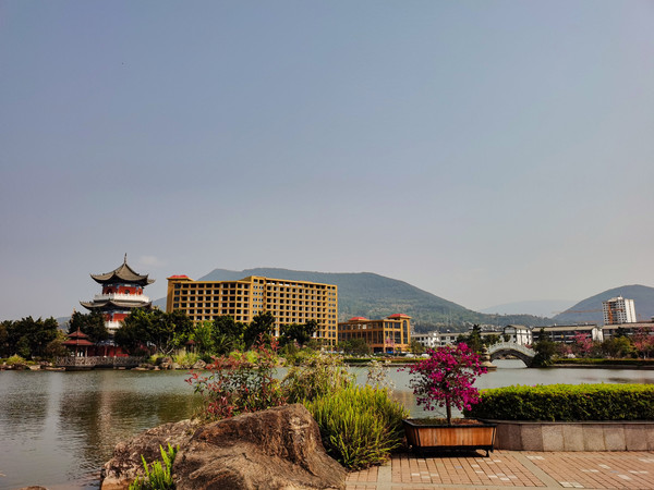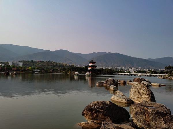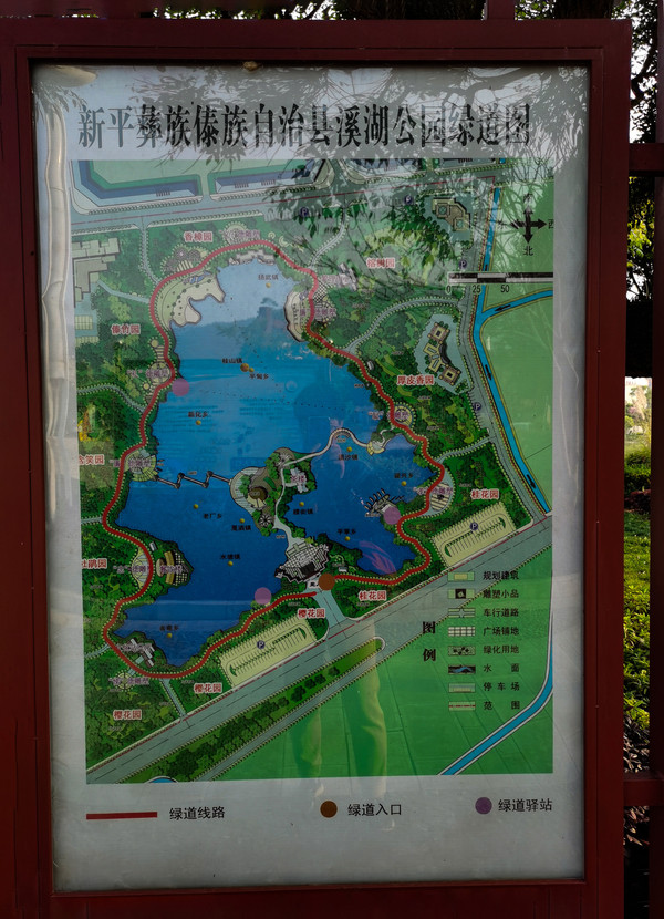 大概下午两点多到了新平县城,给磨盘山国家森林公园打电话,知道景区晚上不让停车,就把车停在国道边上的一停车场,没想到歪打正着,这个停车场在新平县溪湖公园边上,有一片不小的湖面,四周桃花盛开,健身器材步行甬道,洗手池卫生间环湖有好几处,亭台楼阁栈桥相连,安静舒适。还能叫到外卖,索性饭也不做了点了两份外卖,桶装水和晚饭就都解决了。真是意外惊喜。