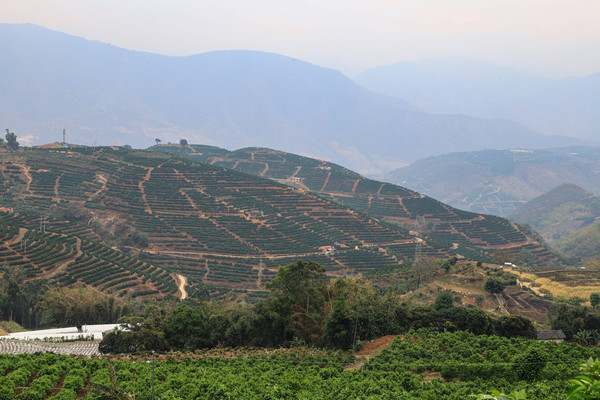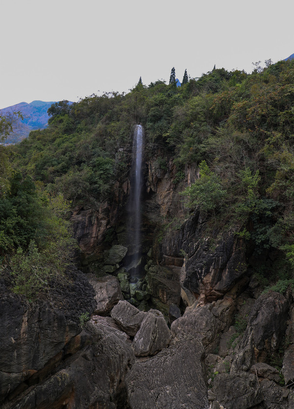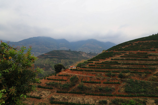 都中午十一点了,大雾还没散去,我们今天要去新平的磨盘山国家森林公园,大概路上要用时三个钟头。我家老头决定不等了,反正是往山下走慢慢开,可能雾也就散了。理想很丰满,现实是我们都挪了五十分钟了,能见度依然不到五米。都到了南恩瀑布了,瀑布的上游都看不到,水幕像是从云雾中冲出来的。等到我们从323国道转到090乡道去看哀牢山梯田时,终于走出了雾区。抬头看看哀牢山头仍然雨雾缭绕 , 哀牢山梯田大多种的是柑橘,和云阳水梯田不同。翠绿的果树在红梯田上排列整齐,特别好看。