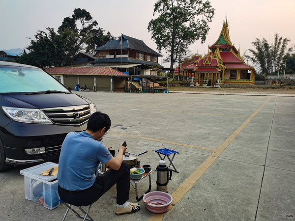 参观完老达堡心情很好,也不觉得累,就继续前进吧。按计划往双江走,到了下午四点多到了第一个驻车点,在214国道边上,是山路转弯处,还有在施工的地方,没法停留。到了上允镇的窝点,是个路边的小院子,没有卫生间,旁边紧邻危房,不太安全。我家老头说前边十公里还有一个驻车点,是个村里的篮球场,到了一看还行,停车做饭结果饭做好了发现新问题了,这是村头的场地,乡土气息浓烈,飞行物密集,根本坐不住,走吧走吧,已经傍晚六点了,直接去双江县城住宾馆吧,不然天黑走夜路太不安全了。路上又遇到两次边防检查,终于在晚上七点半到了双江县城。住在双江创业商务宾馆,来的路上携程上还有房间,到了没标间了,只剩一大床房,问了一下在县城怎么房间还这样紧俏,说是正好赶上冰岛茶博会,各地茶商云集于此。