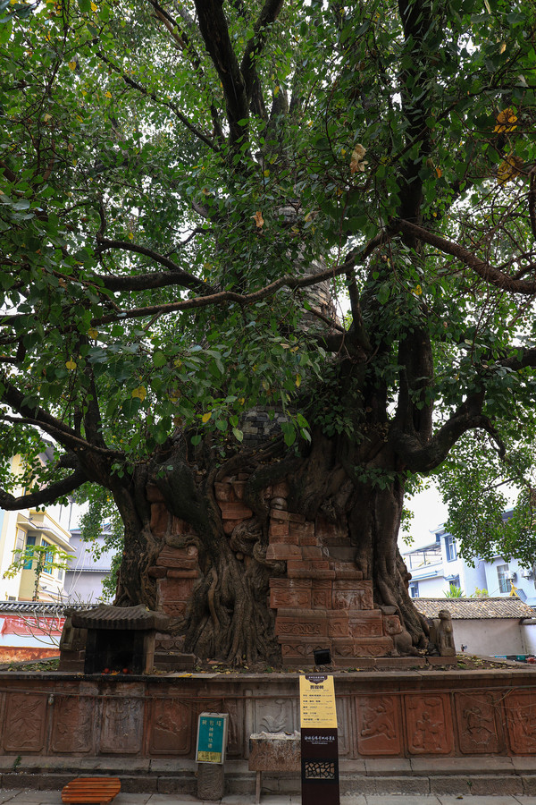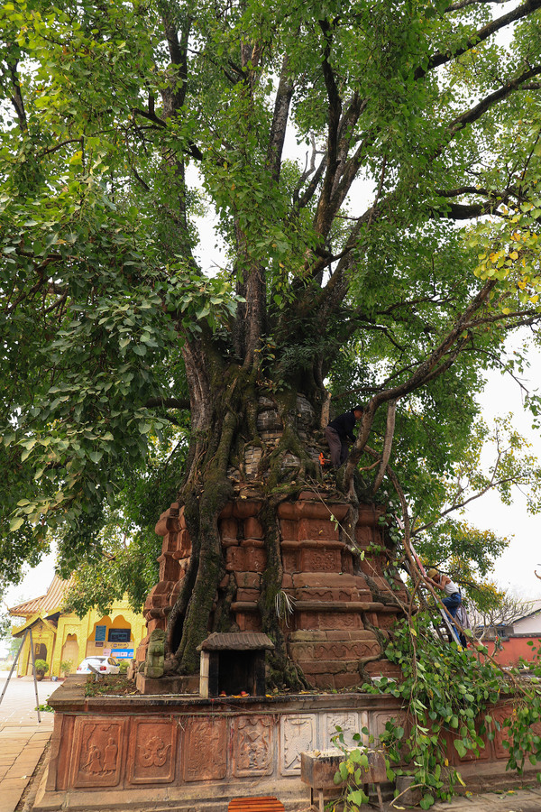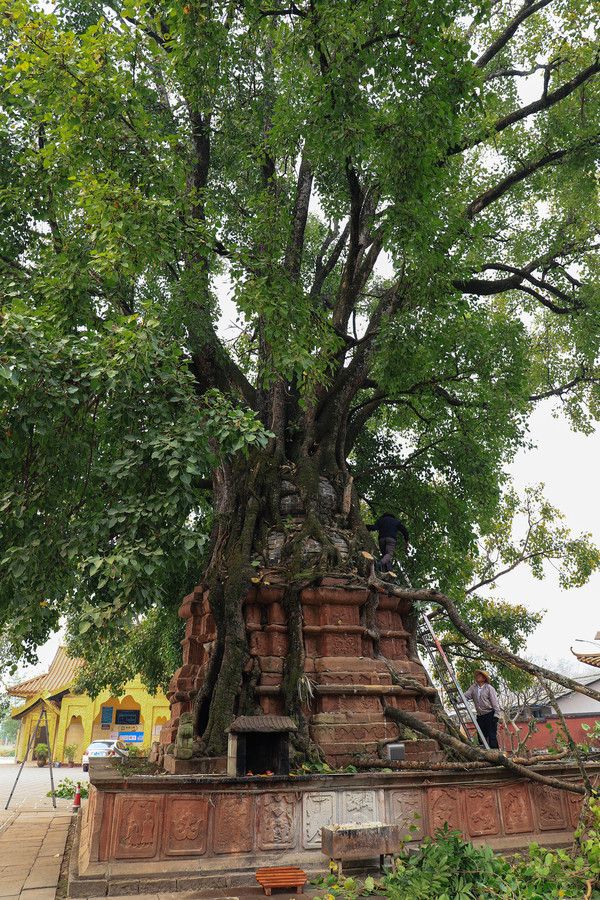 第二十五天3月22日勐卧总佛寺离我们驻车的文体广场很近,开车也就五六分钟。寺庙不大,特别有名。内有双塔,一个塔包树,一个树包塔。我们到的时候,寺里的工作人员在修理树枝。塔包树的几根枝条被虫子蛀空了,安全起见要先清理掉。参观完总佛寺,离开景谷县,经镇沅县到哀牢山自然风景区。