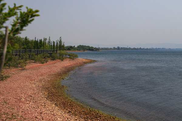 从金滩出来,过笔架山我们到了澄江红山咀,一片粉色的沙滩。沙子细滑,湖水中粉色沙滩衬托的更像是仙景。游客不多全是自驾的。走江川路穿明星小镇,过玉溪抚仙湖国家湿地公园,我们离开抚仙湖奔滇池而去。