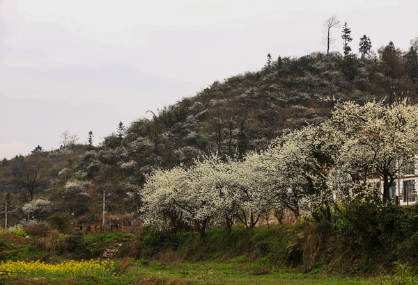 第四天3月1日 在杭瑞高速,雨断断续续的下,五点多到了贵州贵定县盘江镇的金海雪山。景区挺大的免门票,可能太晚了又阴天下雨,没什么游客。金海雪山并不是现实意义的雪山,是因大片油菜花和漫山盛开白似雪的梨花而得名。今天贵定特别冷,本来想去找宾馆入住,从停车场出来发现一住宿吃饭的农家乐,看着还行要价120元,还到100元住下了。觉得明天起来不用挪车就可以去景区了,住下后发现不是一般的差劲,房间本身就不大,卫生间里什么用品也没有,包括厕纸。被子很潮,空调噪音大并且制热效果不好,这次住的地方是自我们自驾游这几年遇到的最差的地方,算是一次教训,以后绝对不能找这种在景区门口吃饭加住宿的地方了
