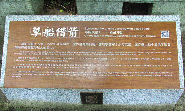 草船借箭是我国古典名著《三国演义》中赤壁之战的一个故事。借箭由周瑜故意提出(限十天造十万支箭),机智的诸葛亮一眼识破是一条害人之计,却淡定表示"只需要三天"。后来,有鲁肃帮忙,诸葛亮再利用曹操多疑的性格,调了几条草船诱敌,终于借到了十万余支箭。
