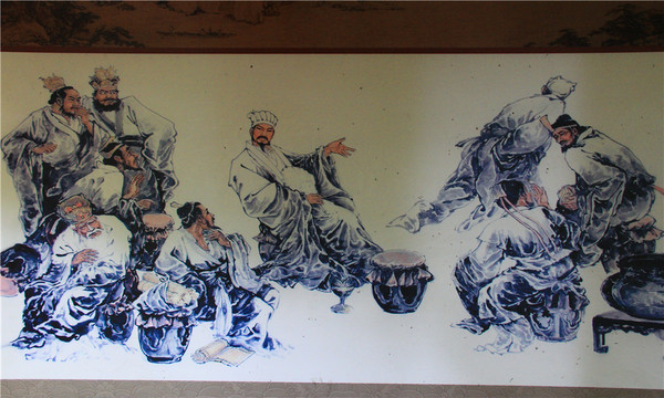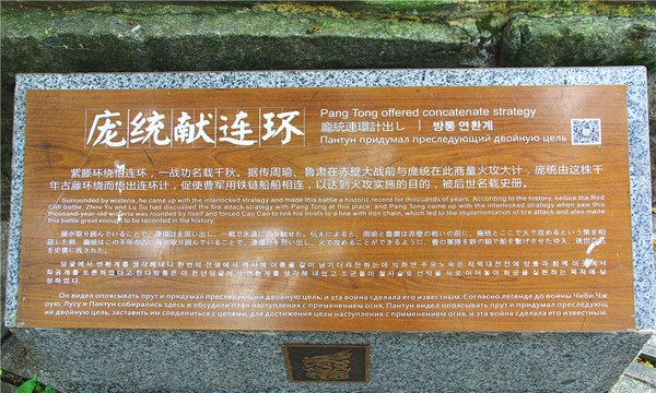 相传赤壁大战中,庞统在草庵内披阅兵书时,巧遇蒋干,遂偕同蒋干过江,向曹操献连环计,使曹操水军“灰飞烟灭”,大败于赤壁。