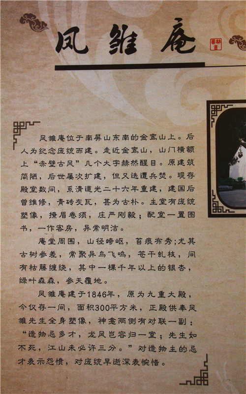 凤雏即庞统。凤雏庵即当年庞统读书的庐舍。座落在金鸾山腰。