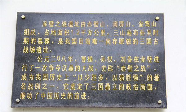 三国赤壁古战场是赤壁之战发生地,位于湖北省咸宁市赤壁市南岸是我国古代"以少胜多,以弱胜强"的七大战役中唯一尚存原貌的古战场。