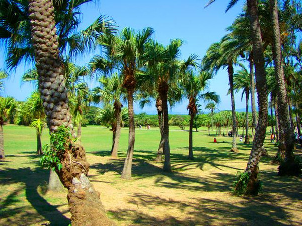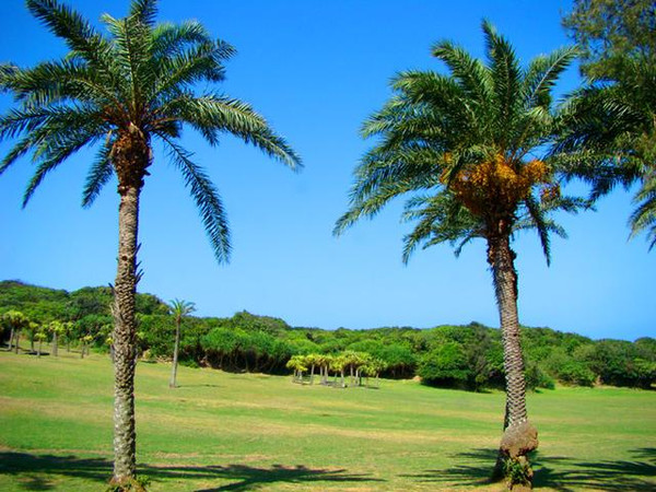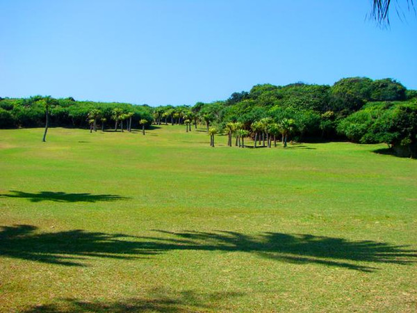 走进鹅銮鼻景区,映入人们眼帘的是一片绿草如茵,如高尔夫球场般的大草甸。站在高处远眺,茂密的绿色植被以一望无际的碧蓝大海为背景。草甸上分布着一些台湾特有的高高挺拔的槟榔、椰子树等,优美的海滨风光似一幅壮美的大自然画卷,令人赏心悦目。