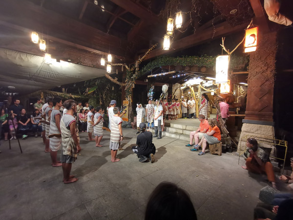 3、虽然只有十几个演员,但伴着原始的战鼓声舞起来也挺有气势的,印象最深的舞蹈是:那威神在后面看着他们,他们勇敢战斗,把敌人扑倒后作势把头砍下,拿着假头挥舞并向神献祭。我以为女儿会害怕,没想到女儿看着哈哈的,主持人还过来问她知道挥舞的是什么吗?她说是棉花。