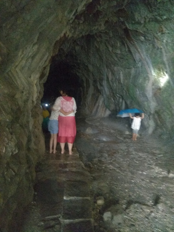 道路尽头右边的路是著名的水帘洞。我们又穿过几十米潮湿的洞,山间宽敞起来,游客川流不息的很热闹。前面水池中,是用一个个平整石块摆成的路,伸向前面更深遂的黑洞,那就是属于猴王的水帘洞了。在洞口垒的石墙上,晾着前面的游客留下来的雨衣,可以让大家反复穿,还有工作人员在清理杂物。我踩着石块路走进洞口时,感到脚下流过石间的泉水很凉快,就想试着从泉水里逆流而上趟进洞,结果不到一分钟就冻上来了,那水冰得刺骨啊!洞里边上有石路,不宽但很平整,大家鱼贯而行。山顶的泉水从无数的石缝中渗洒下来,形成一片片的水帘,打在洞内石壁上啪啪作响,但打在身上的感觉一点都不冷,倒是有点按摩的意味,真是解暑的最佳体验。