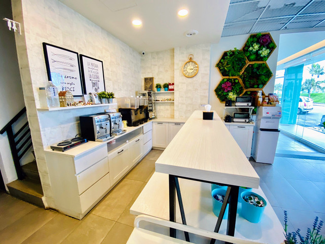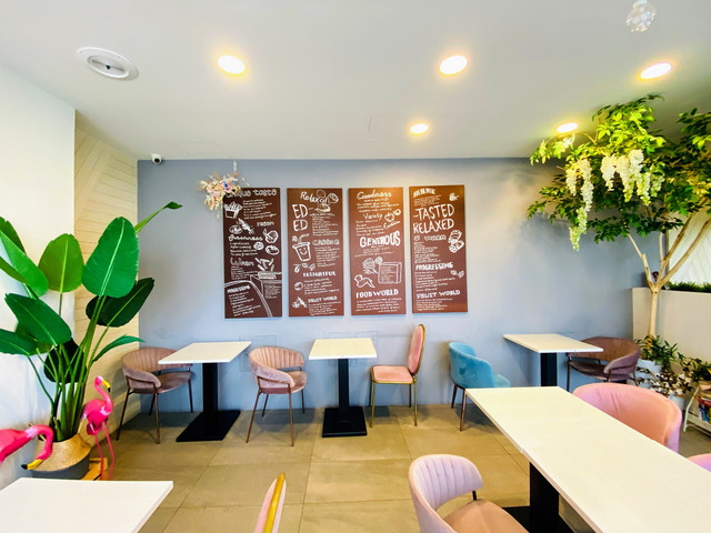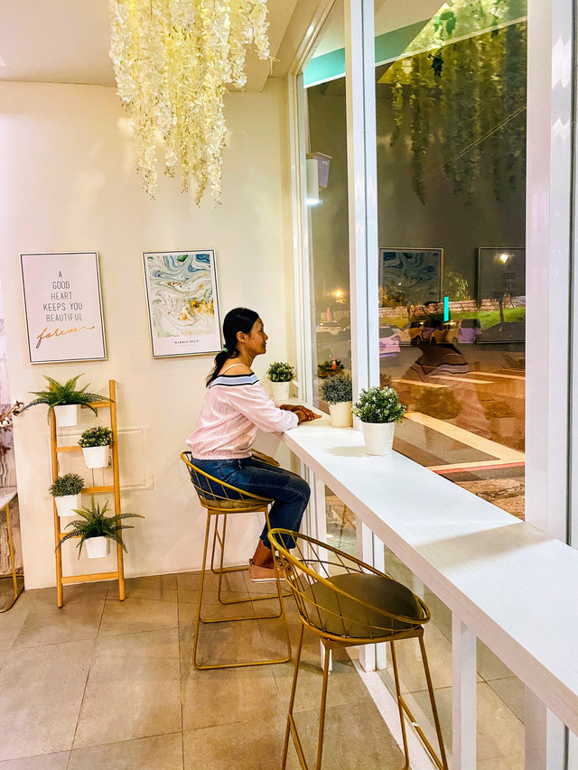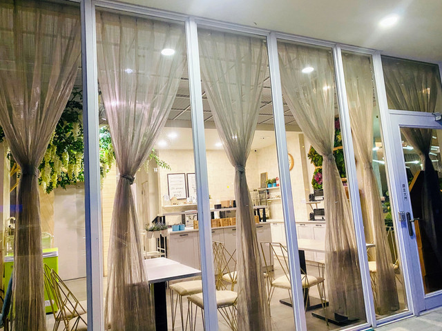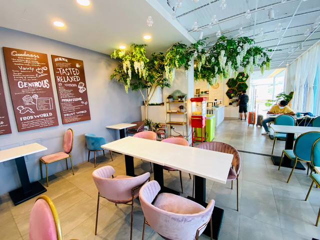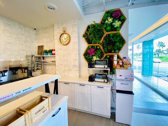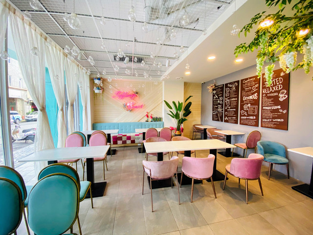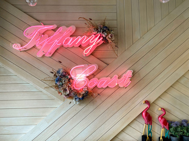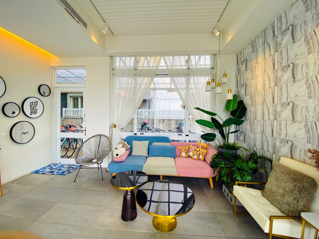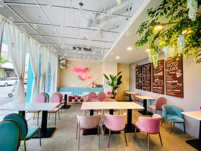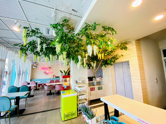 整棟以TIFFANY藍為色調的外觀,靈動又夢幻。一樓交誼廳結合餐廳全是透明玻璃,內部的設計皆是網美餐廳的夢幻因子,網狀的天花板上懸掛著水晶燈再加上垂落的乾燥花,牆上有發光 Tiffany Coast 粉紅霓虹燈,像馬卡龍的粉色及水藍色的座椅,十足的美少女夢幻世界。
